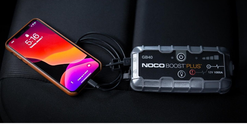 Ο NOCO Boost Plus GB40 λειτουργεί και ως φορητό power bank, επιτρέποντας τη φόρτιση συσκευών όπως smartphone, tablet, smartwatch και άλλων USB συσκευών. Παρέχει έως και 4 πλήρεις φορτίσεις smartphone και επαναφορτίζεται πλήρως σε περίπου 3 ώρες μέσω USB 2.1A.
